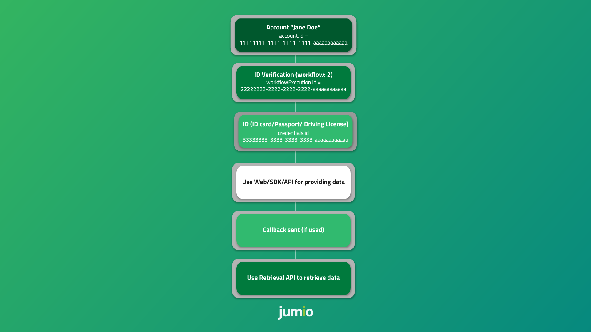US: https://api.amer-1.jumio.ai/api/v1/accounts/<accountId>/workflow-executions/<workflowExecutionId>