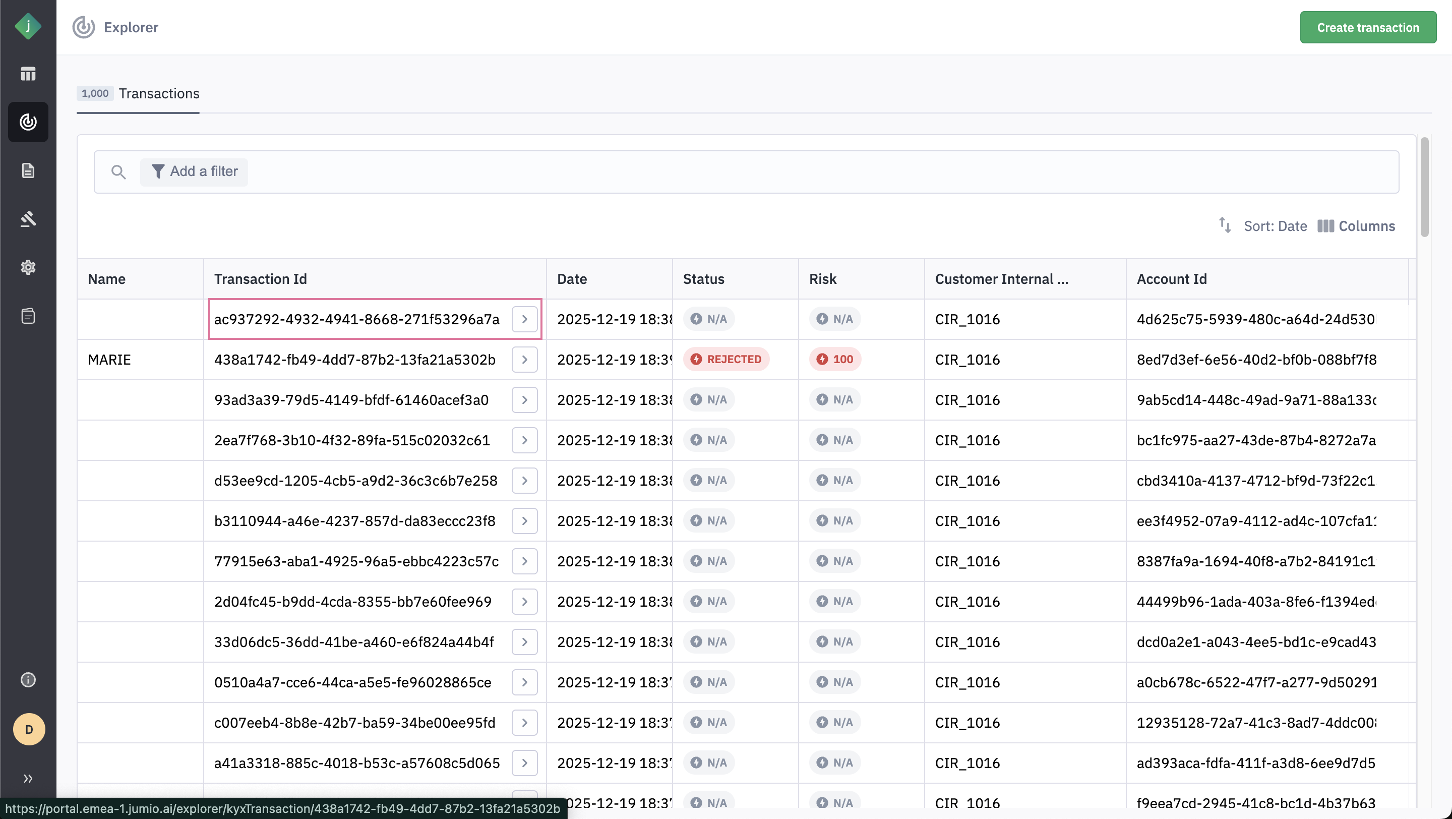 Step 1: From the Transactions tab of the Explorer, click Create Transaction.