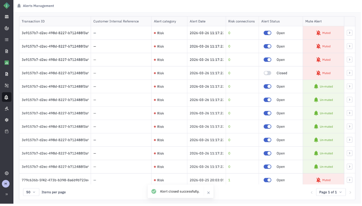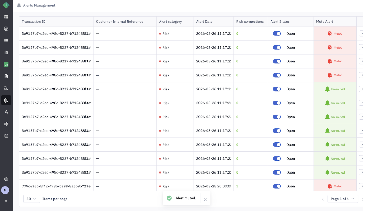 | Muted/Unmuted Status | Provides an option to mute all alerts for the transaction (not specific to Alert Category and Risk Reason) via the Alerts Management view. If set to “Muted”, the transaction will not be alerted again |