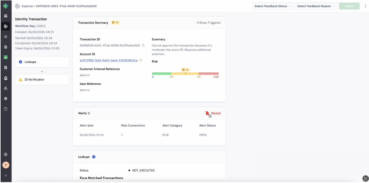 Mute Transaction - It provides an option to mute all alerts for the transaction and not for a specific Alert Category and Risk Reason, which is available through Alerts Management View. If “Muted”, then this transaction will not be alerted again.