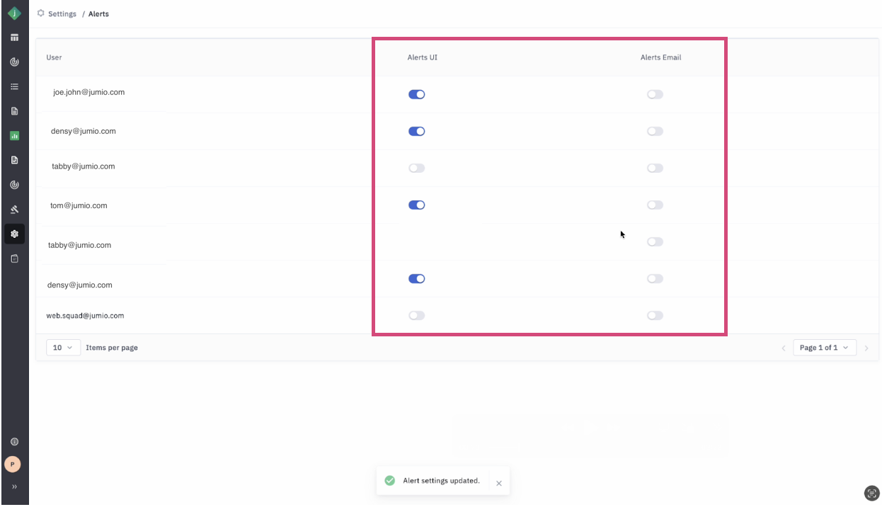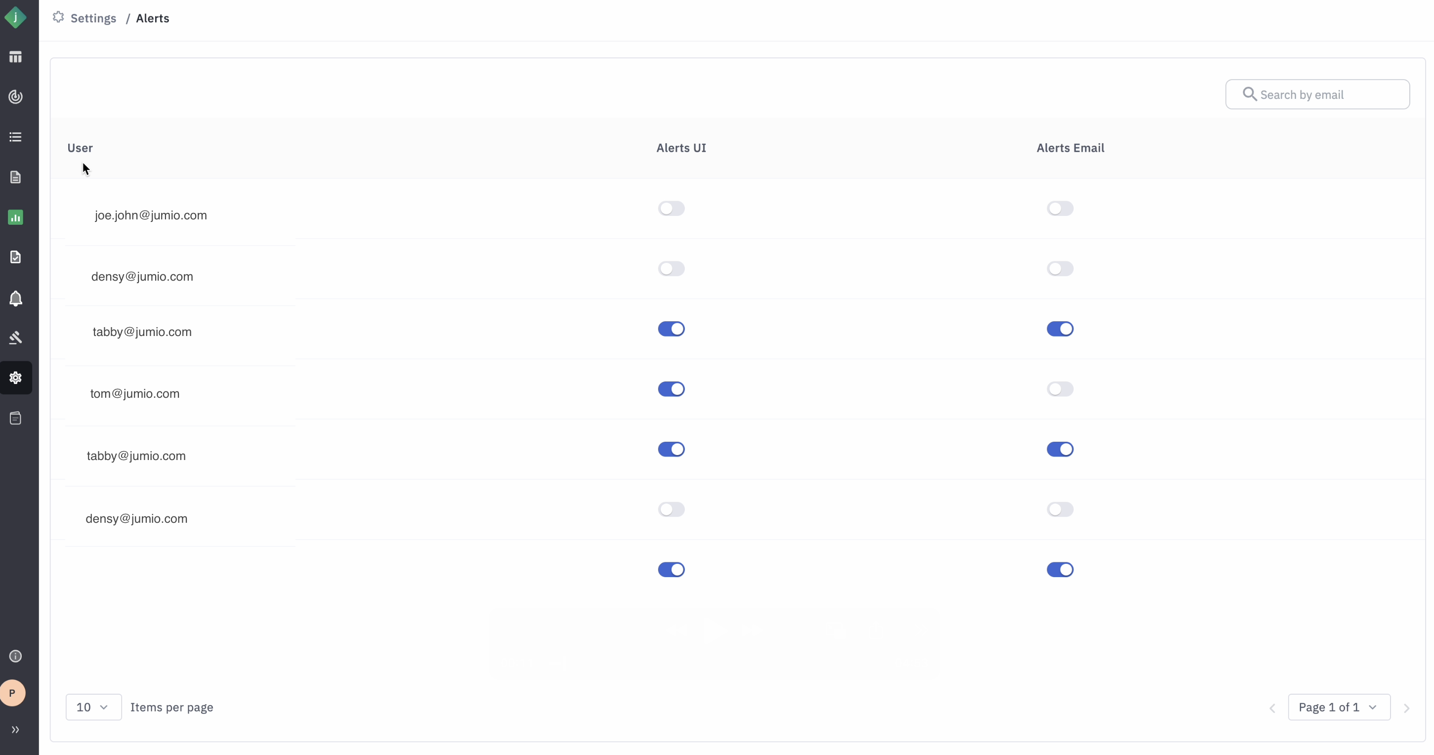 Step 3: Toggle the "Email Alerts" or "UI Alerts" options next to each user to enable or disable specific notification types.