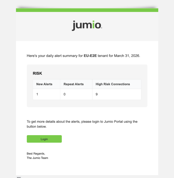 Your Jumio Portal users can be configured to receive the Daily Alert Summary over email addresses configured within the Jumio Portal. New users interested in receiving these alerts will need to have their account created on the Jumio Portal for your tenant.