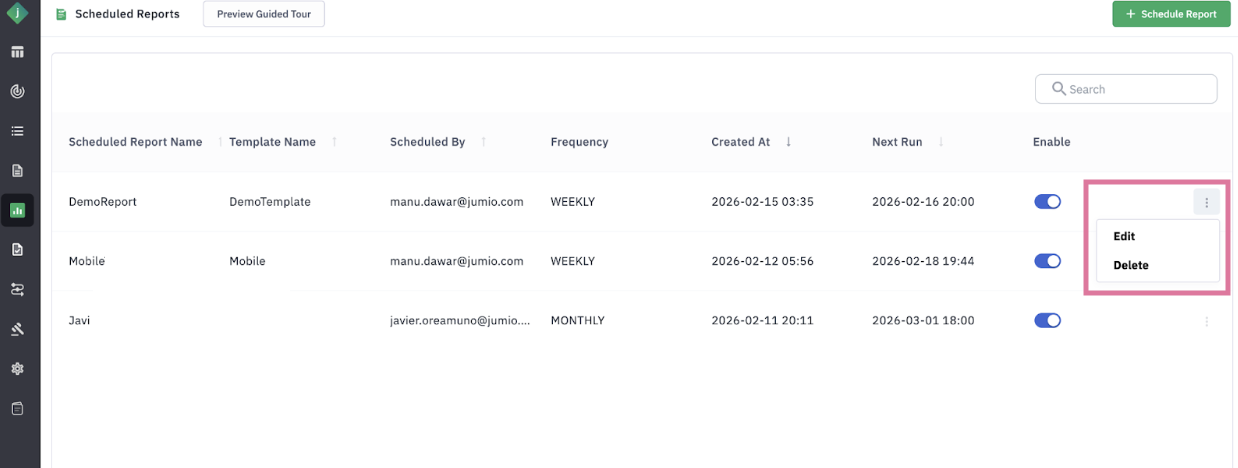 Step 6: You can manage your scheduled reports using the Edit, Delete, and Enable/Disable options found within the page.