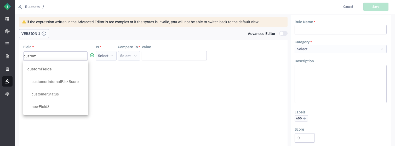 - Customers can create custom rules based on the defined custom fields, enabling more granular and specific risk evaluations.