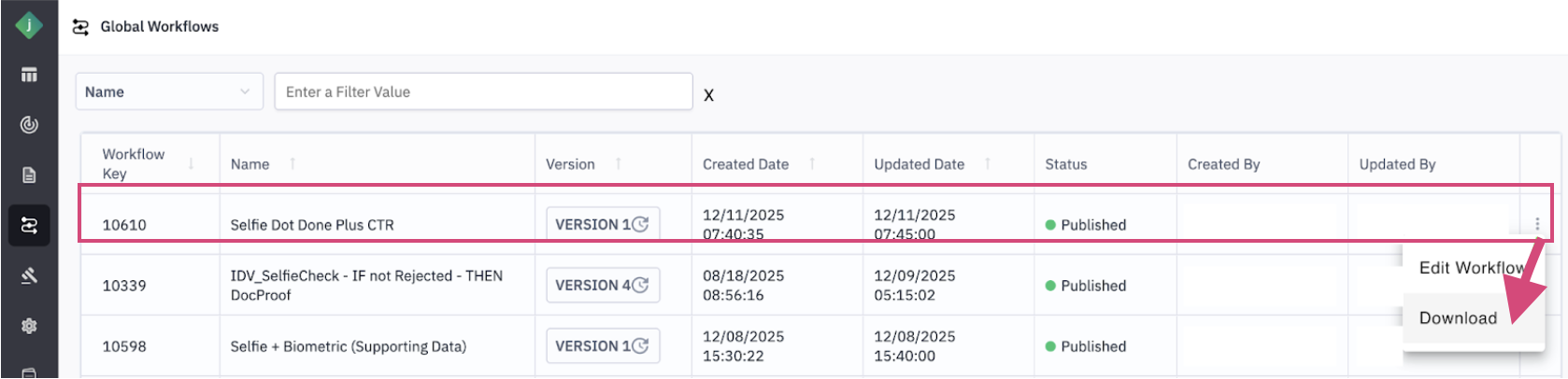 The Workflow Listing screen provides a centralized view of all workflows created in your Jumio account, whether Global or Custom. From this screen, you can search, filter, and manage workflows efficiently, including accessing specific versions, reviewing statuses, and initiating edits.