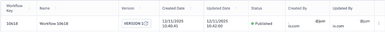 | Version | Displays the current version number of the workflow (e.g., Version 1.0, Version 2.0). The latest version is shown by default in the listing. You can view and access previous versions by clicking the version label in the same row. |